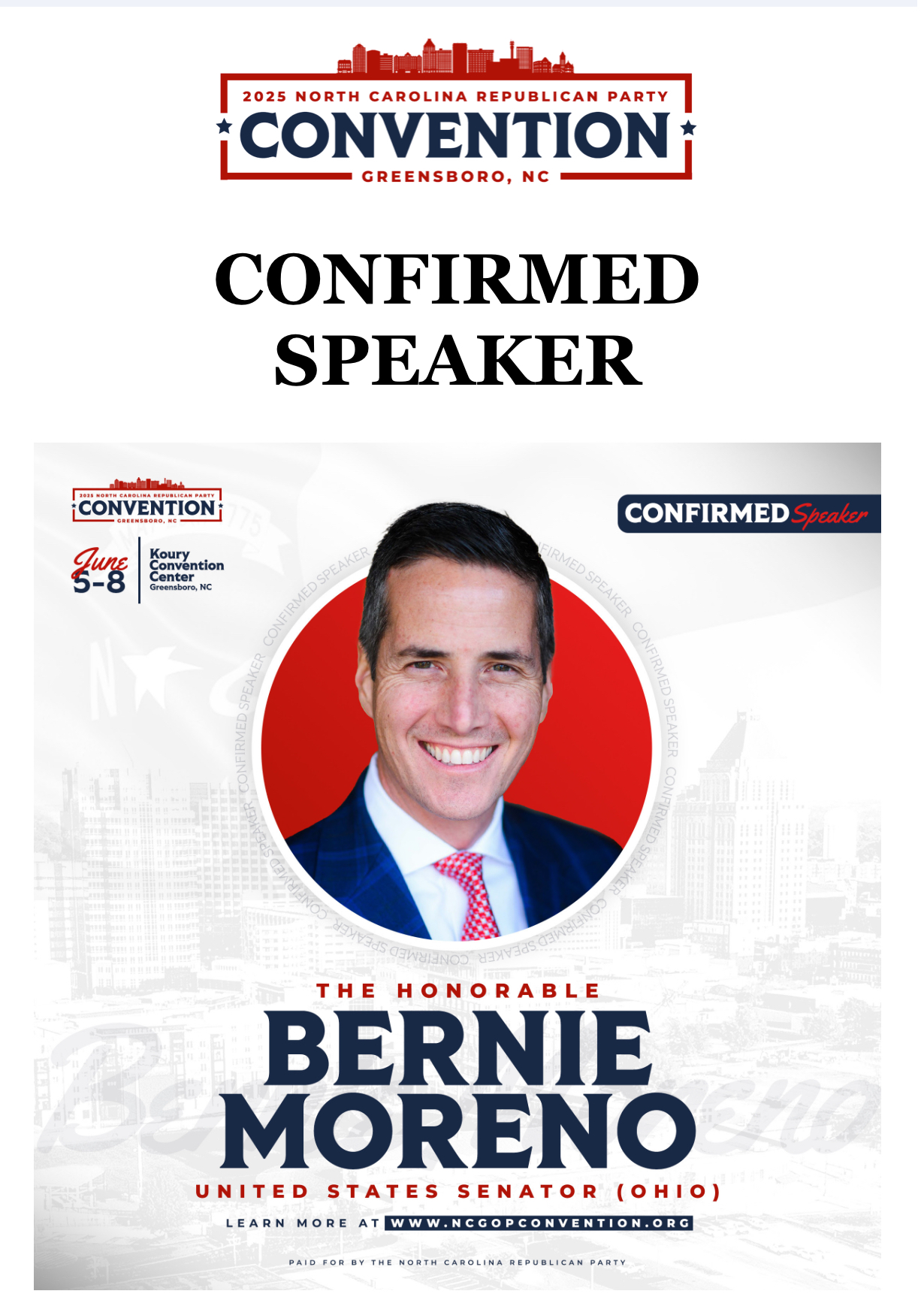 We are excited to announce United States Senator Bernie Moreno from the great state of Ohio will be a keynote speaker at the Friday Night Grand Old Party Dinner.